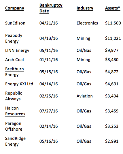 Next up is The Danger Report. Below is a list of 10 of some of the biggest bankruptcies in 2016 and their industries.